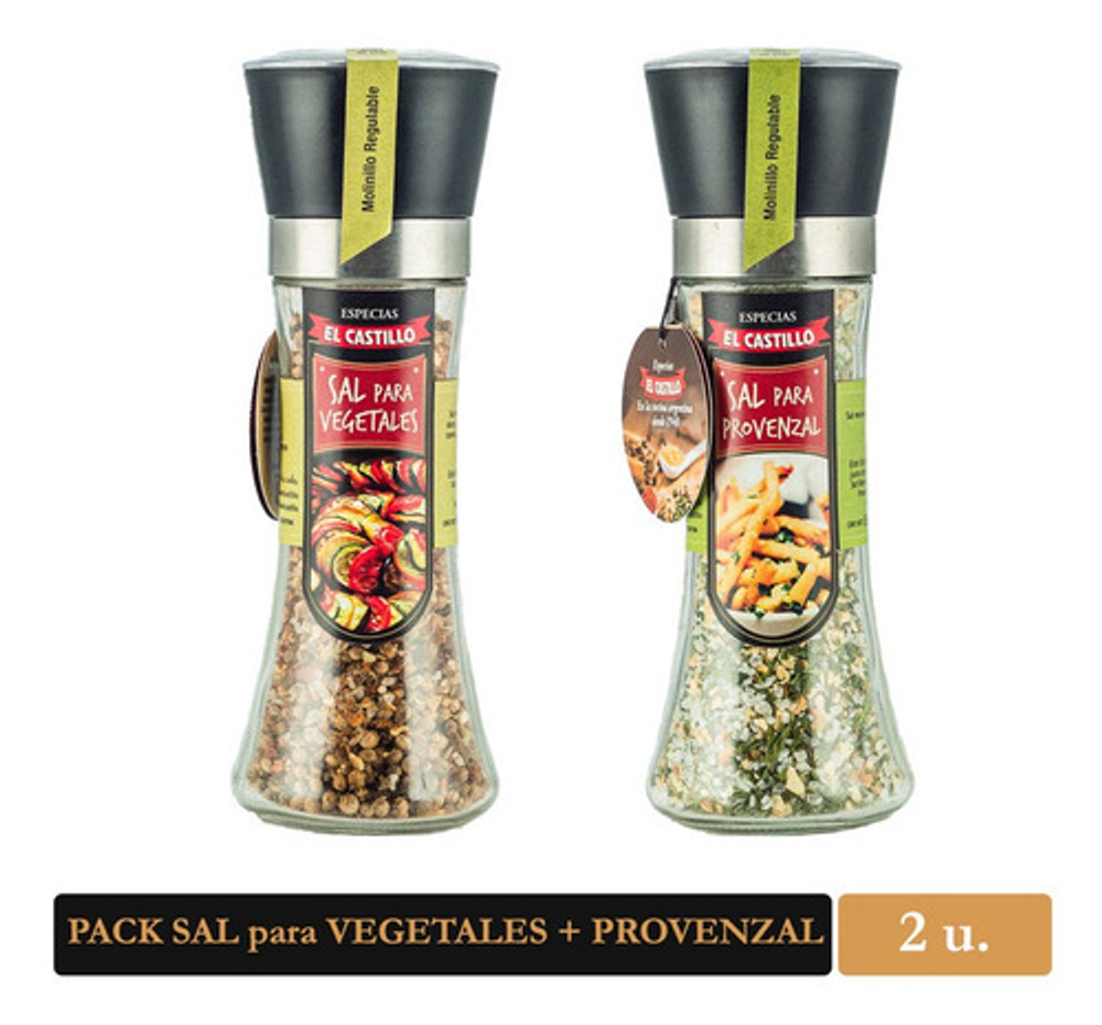 Este Pack contiene un molinillo de Sal para Vegetales de 90 grs. y otro de Provenzal de 130 grs. Nuestra Sal para Vegetales es un blend especialmente diseñado para ser utilizado en preparaciones que contengan vegetales. Esta Sal es perfecta para acompañar tus verduras tanto crudas, como grilladas o hervidas. Maridar con un buen aceite. Mientras nuestra Sal para Provenzal ni tiene secretos: es el balance justo de ajo y perejil deshidratados con Sal Marina. Aporta el sabor tradicional Provenzal a tus comidas: Papas, Vegetales, Milanesas, Salsas, y mucho más!