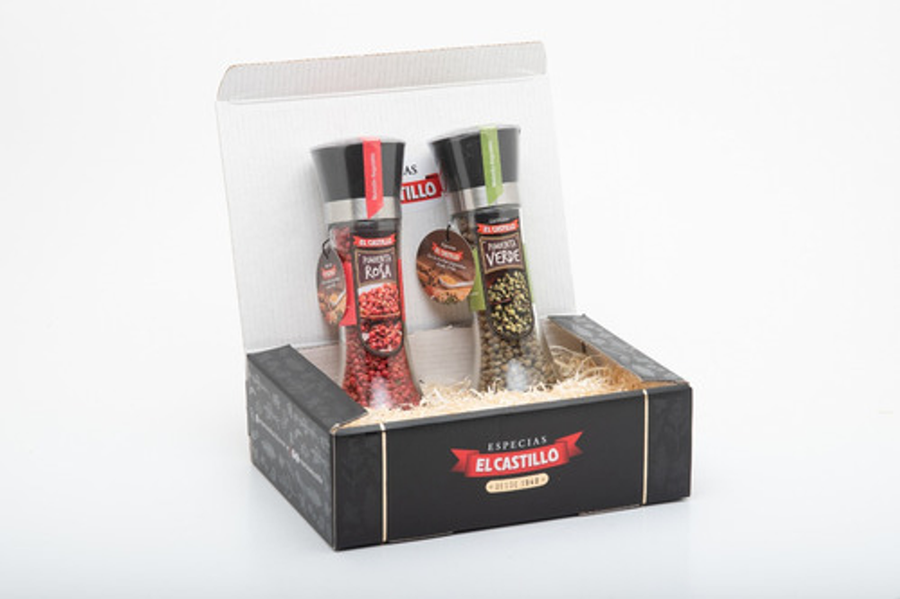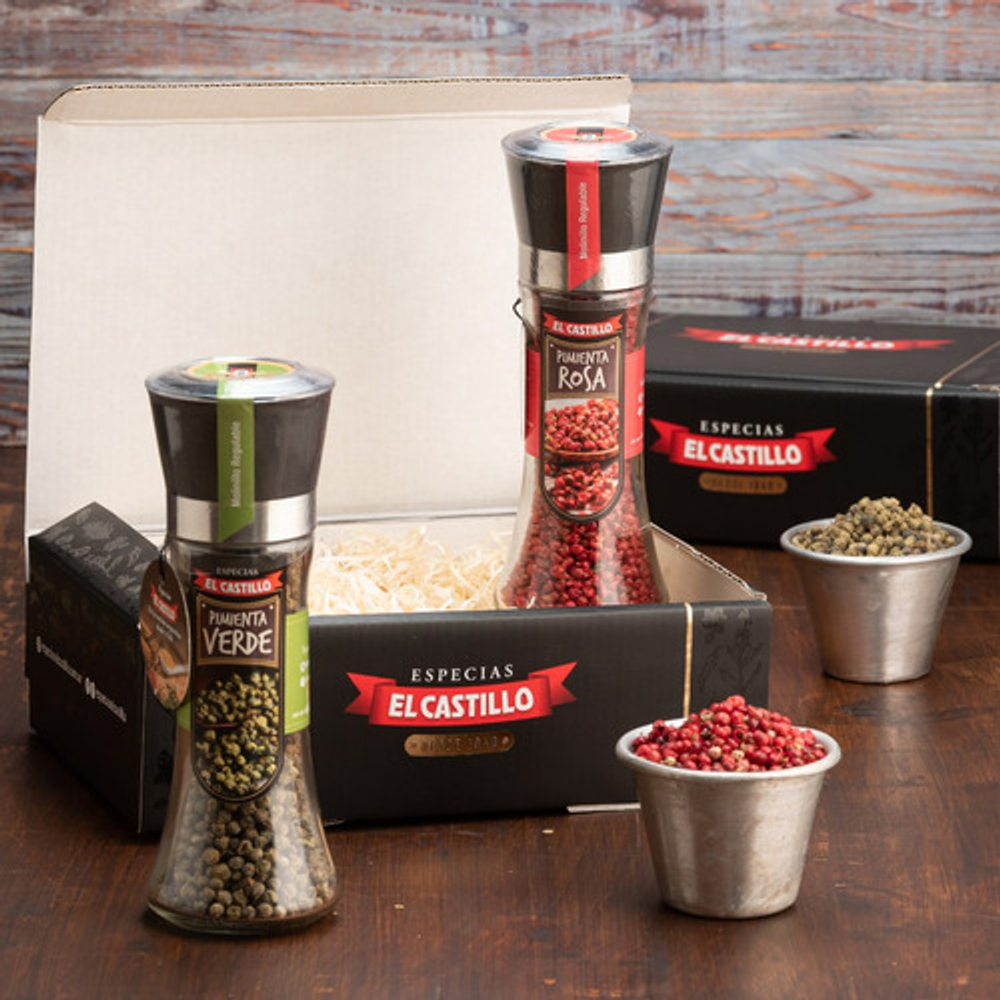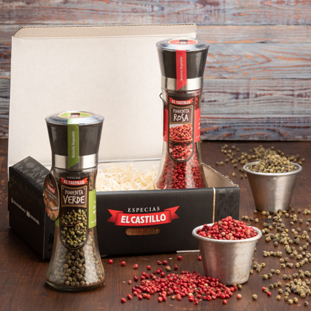 La mejor Selección de nuestros Clásicos Molinillos Profesionales Presentado en un practico BOX GOURMET con finas terminaciones, contiene lo siguiente: • 1 pimienta Verde en Grano importada • 1 pimienta Rosa en Grano importada Nuestros productos son elaborados cumpliendo los más altos estándares de calidad y frescura, importando los clásicos Pimentones y Azafranes desde hace casi 80 años. Este BOX GOURMET esta especialmente diseñado para Regalos, e incluye una Selección de nuestros clásicos Molinillos Profesionales, en un envase de vidrio recargable y reutilizable con cabezal regulable de alto rendimiento SOMOS EL CASTILLO – 80 años llevando el sabor a tus platos Información importante para concretar tu compra. CÓMO COMPRAR