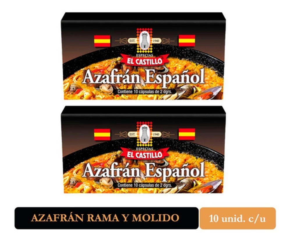 Este Pack contiene 10 unidades de Azafrán en Rama y otras 10 unidades de Azafrán Molido, cada una es de 2 dg.. Importamos Nuestro Azafrán “El Castillo” de la zona de producción por excelencia en ESPAÑA (Novelda – Alicante), desde hace mas de 80 años. El proceso de molienda se realiza en forma artesanal, con un Molino de bolas de acero, ya que debe ser realizado muy lentamente, y en frío, para no alterar el color del producto final. El Azafrán es Molido y fraccionado por nosotros en cápsulas de hojalata, para poder conservar intactas sus propiedades, a través del tiempo.