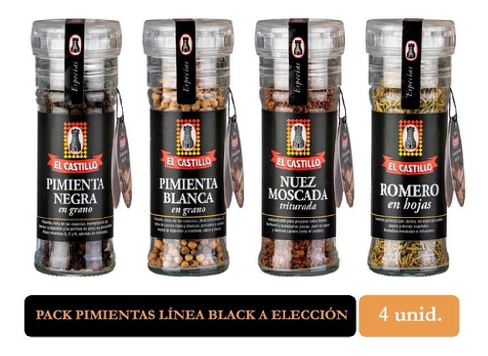 Este Pack contiene 4 Molinillos A ELECCIÓN. Nosotros creamos una selección especial de productos, la que se encuentra en la foto portada, pero igualmente puede crear su propio pack con los productos que usted prefiera. Los Molinillos disponibles son: