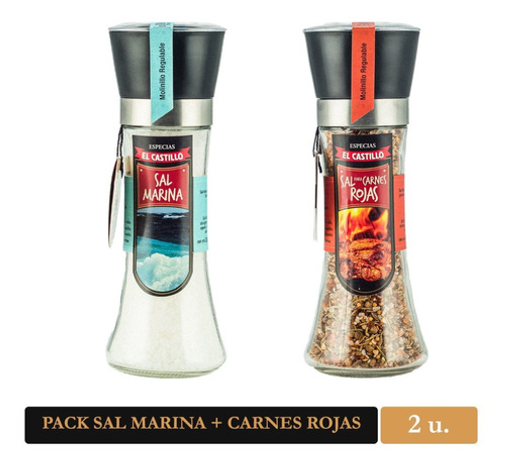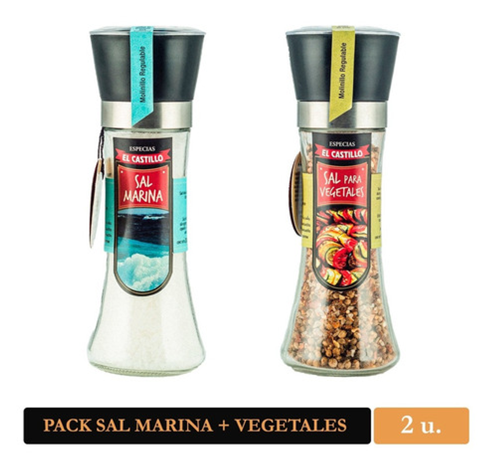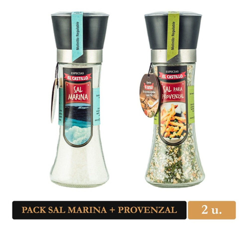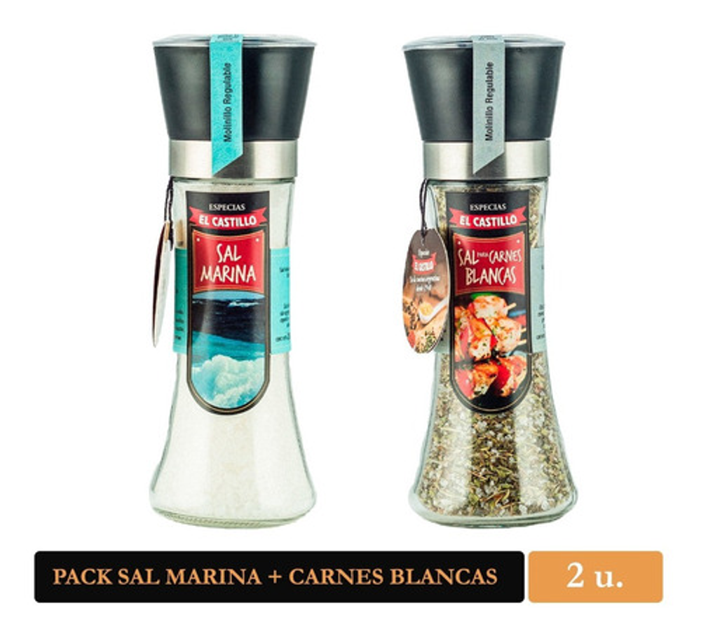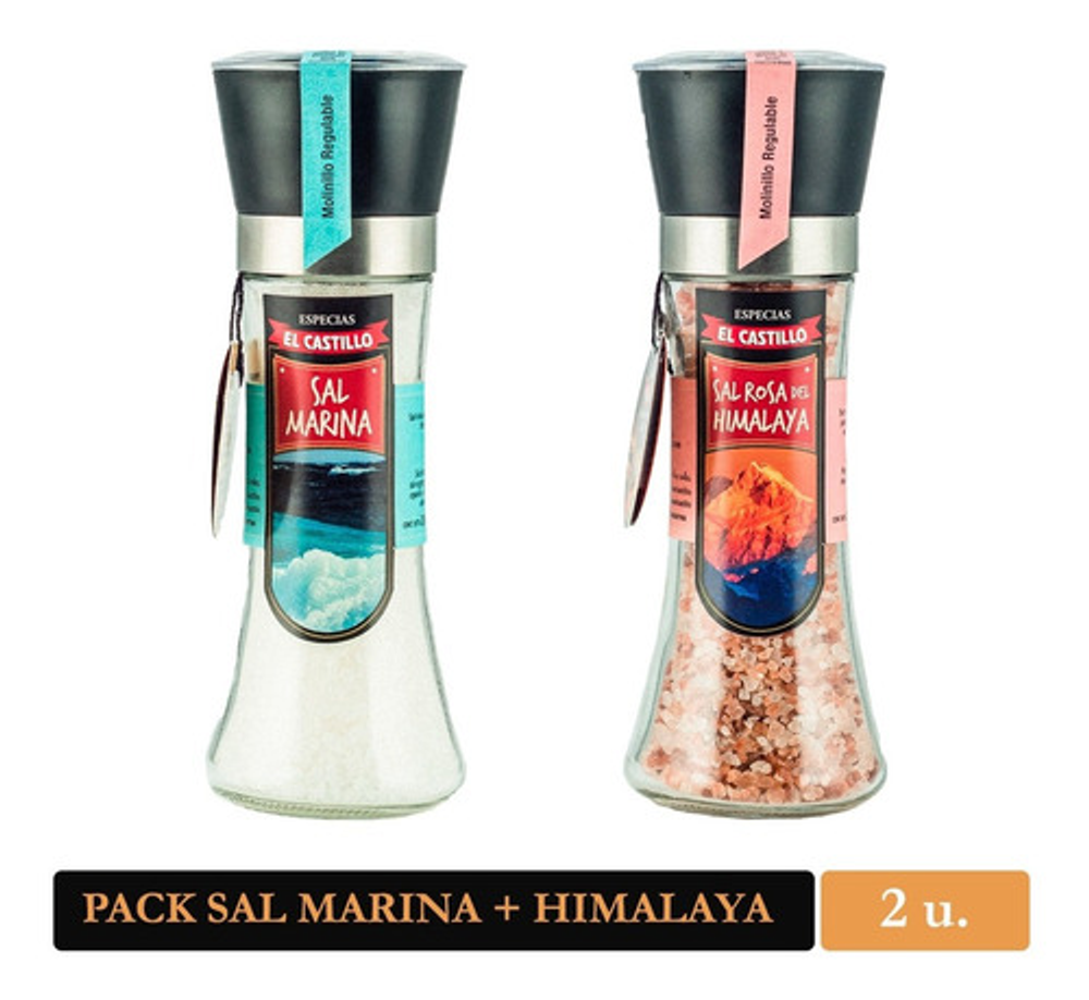 Este Pack contiene un molinillo de Sal Marina de 200 grs, y otro molinillo A ELECCIÓN. . Nuestra Sal Marina fue recolectada del delta Ebro, Tarragona, España. Sal secada naturalmente al Sol, sin agregado de productos químicos, ayuda a drenar líquidos del cuerpo y eliminar toxinas de la piel. Puede crear su propio pack con el producto que usted prefiera. Las variedades disponibles son: