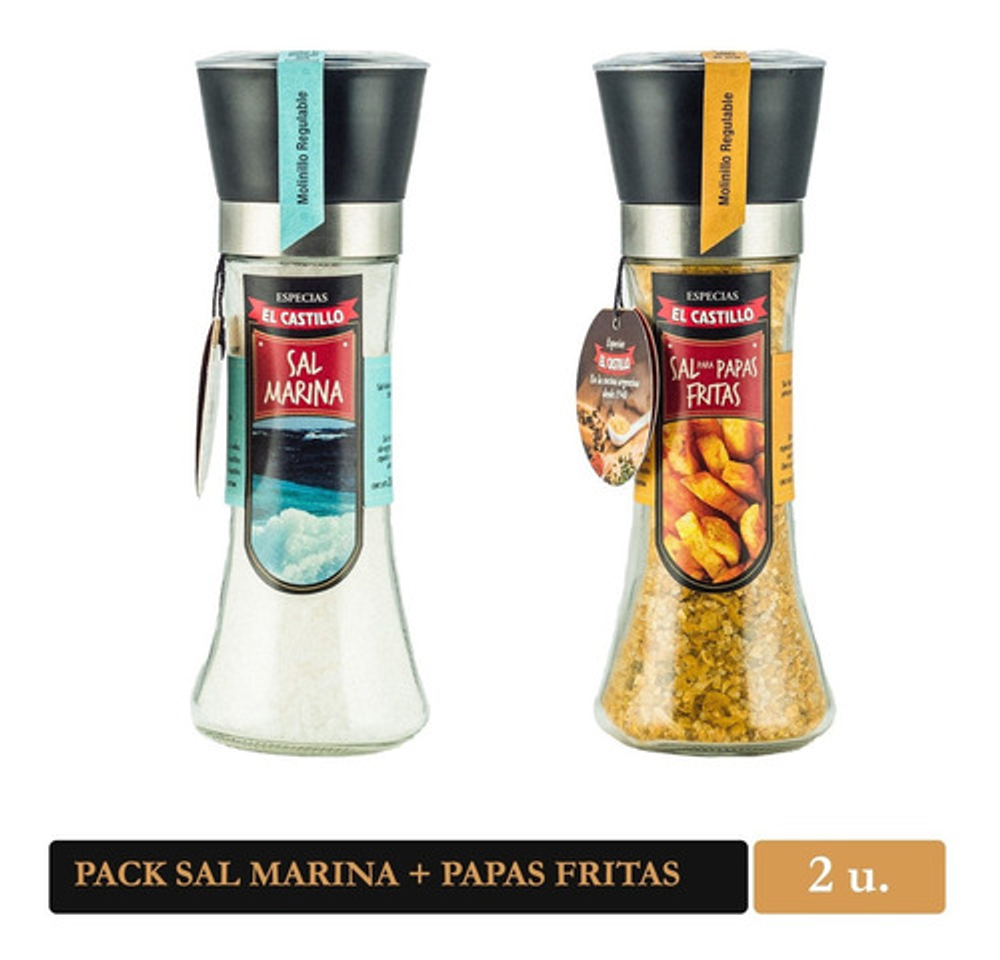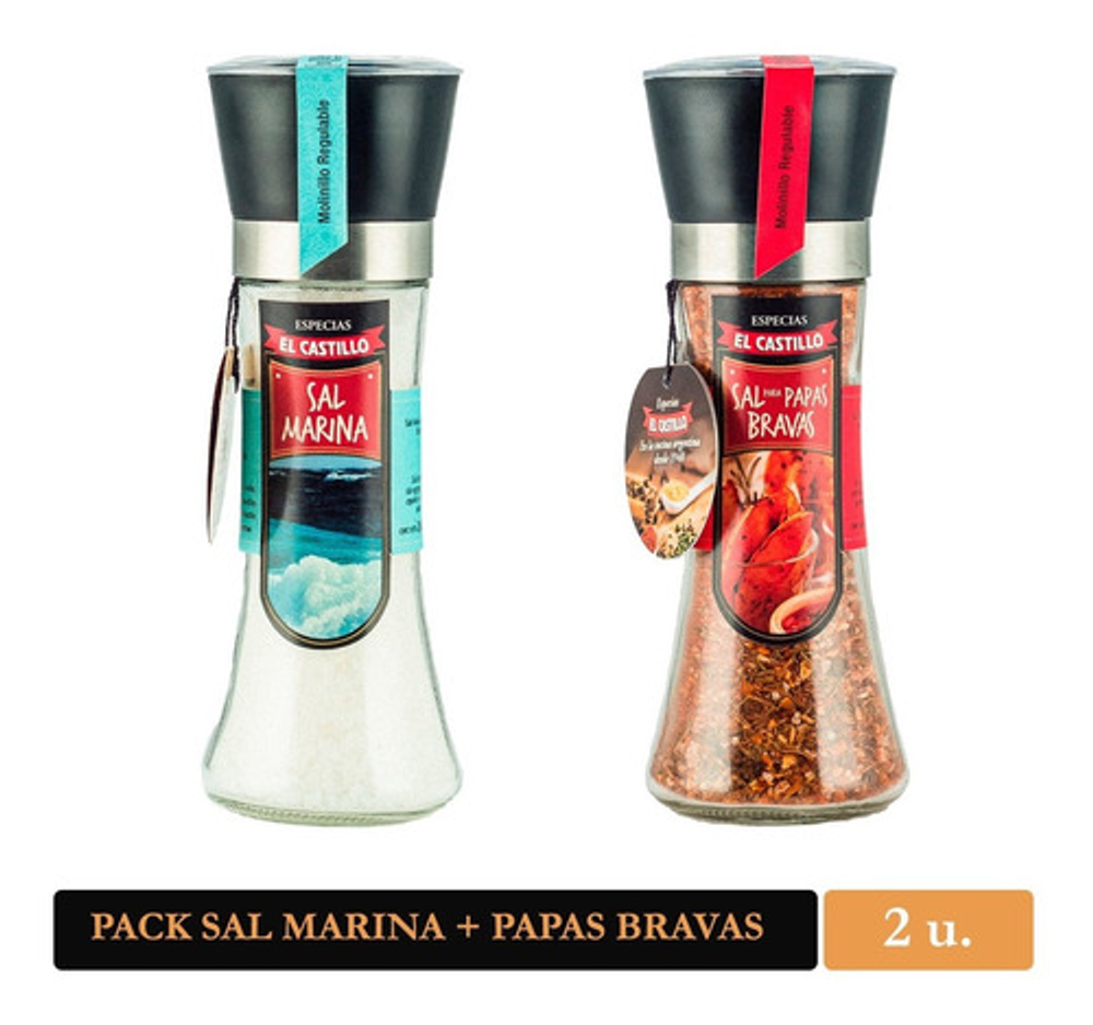 Sal para Papas Bravas Por favor, al finalizar su compra especificar que molinillo quiere que incluyamos en su pack. En caso de no especificar enviaremos la sal que se encuentra en la foto portada que es la Sal para Carnes Rojas. El peso del Pack varía según la selección de productos.