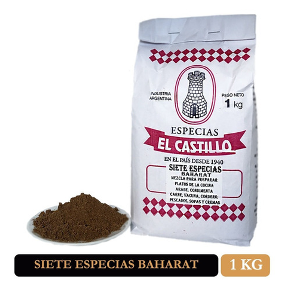 Nuestro Siete Especias Baharat presentado en un paquete de UN KILO.Este mix de especias es muy utilizado en la cocina árabe, judía y turca. Este Blend que preparamos es único en su aroma y sabor. Indispensable en la maceración de carnes y comidas de Medio Oriente en general. Está formado por Pimienta Jamaica, Canela, Fenogreco, Clavo de Olor, Jengibre, Nuez Moscada y Pimienta Negra. Este blend viene presentado en un paquete de UN KILO. SOMOS EL CASTILLO – 80 años llevando el sabor a tus platos