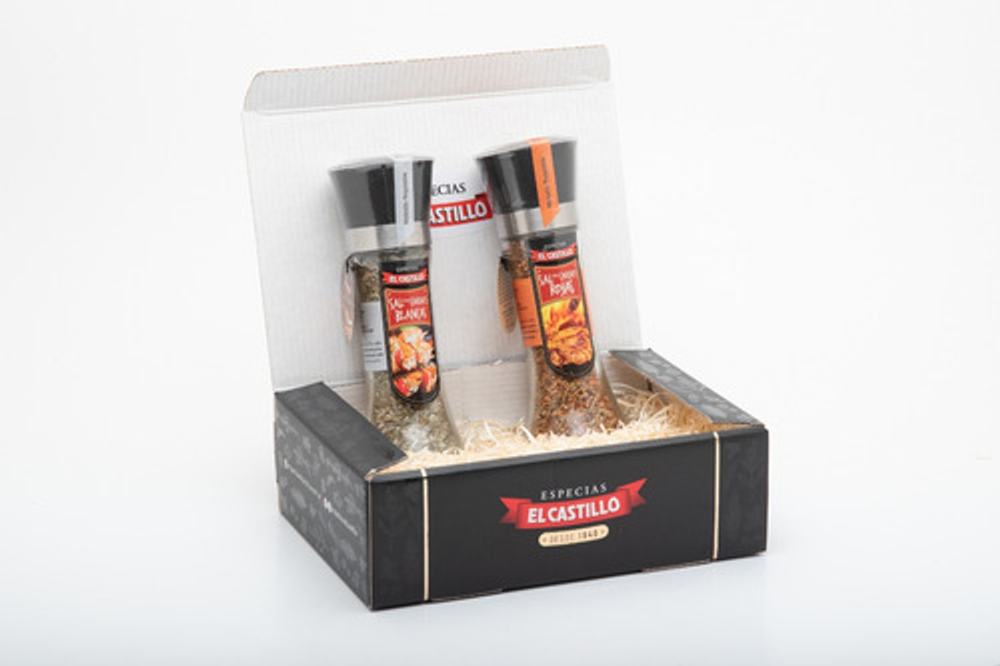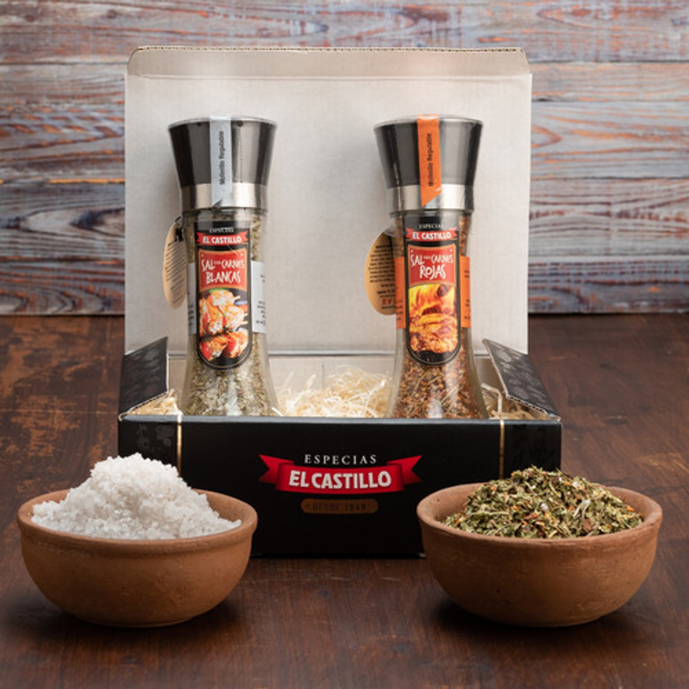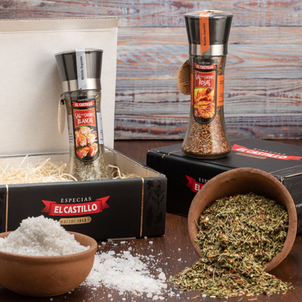 La mejor Selección de nuestros Clásicos Molinillos Profesionales Presentado en un practico BOX GOURMET con finas terminaciones, contiene lo siguiente: • 1 sal para Carnes Rojas • 1 sal para Carnes Blancas Nuestros productos son elaborados cumpliendo los más altos estándares de calidad y frescura, importando los clásicos Pimentones y Azafranes desde hace casi 80 años. Este BOX GOURMET esta especialmente diseñado para Regalos, e incluye una Selección de nuestros clásicos Molinillos Profesionales, en un envase de vidrio recargable y reutilizable con cabezal regulable de alto rendimiento SOMOS EL CASTILLO – 80 años llevando el sabor a tus platos Información importante para concretar tu compra. CÓMO COMPRAR
