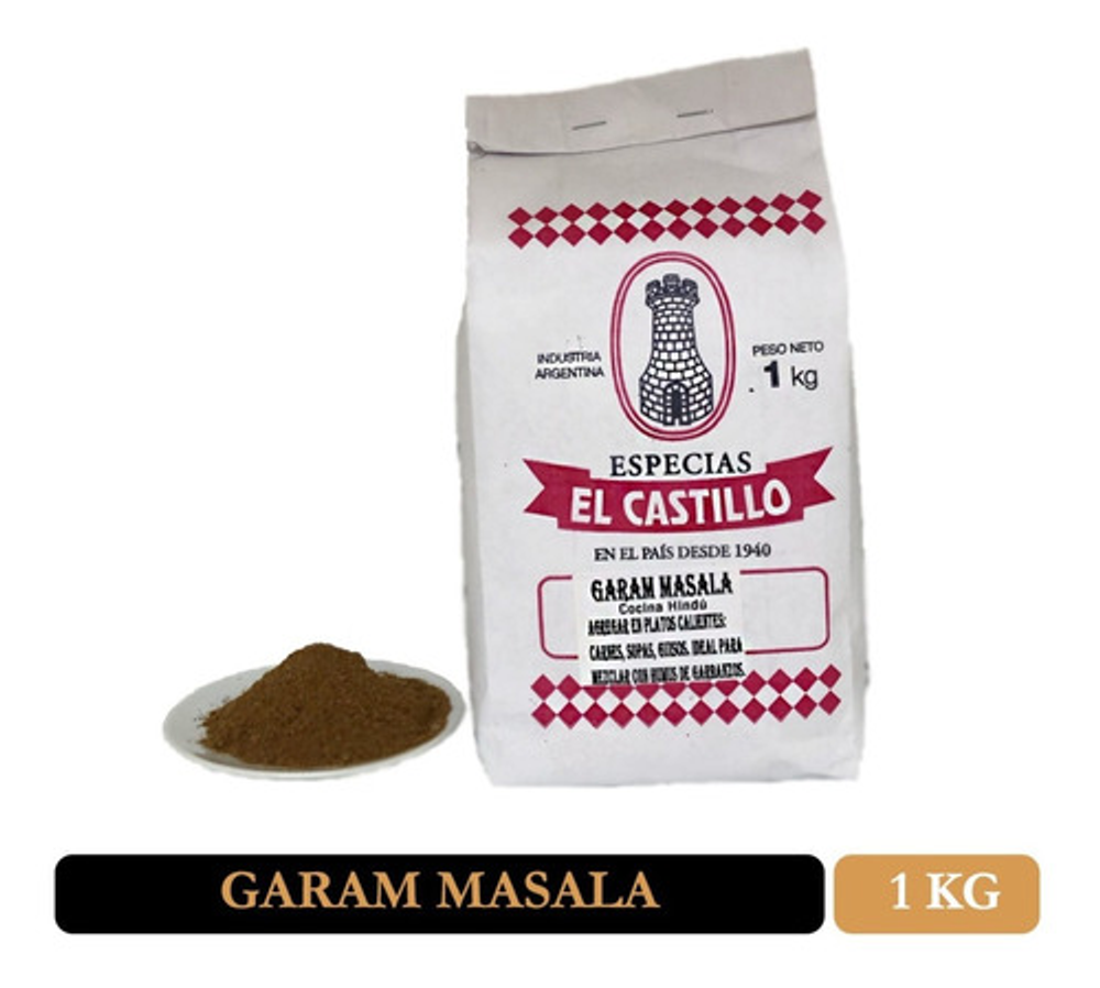 Nuestro Garam Masala, original de la India, es similar al Curry, aunque no contiene Cúrcuma. Esta formulado en base a cardamomo, comino, pimienta negra, cayena, clavo olor, etc. Su sabor único, muy aromático, es ideal para ser utilizado en Carnes y estofados en general. También sirve para arroz, y vegetales en preparaciones de olla. Este Blend es preparado con Cardamomo, Comino, Pimienta Negra, Pimienta Cayena, Clavo de Olor, Nuez Moscada, Frenogreco y Cilantro. Viene presentado en un paquete de UN KILO.