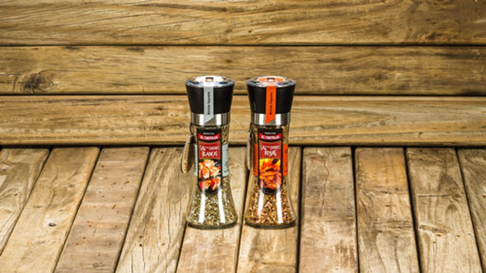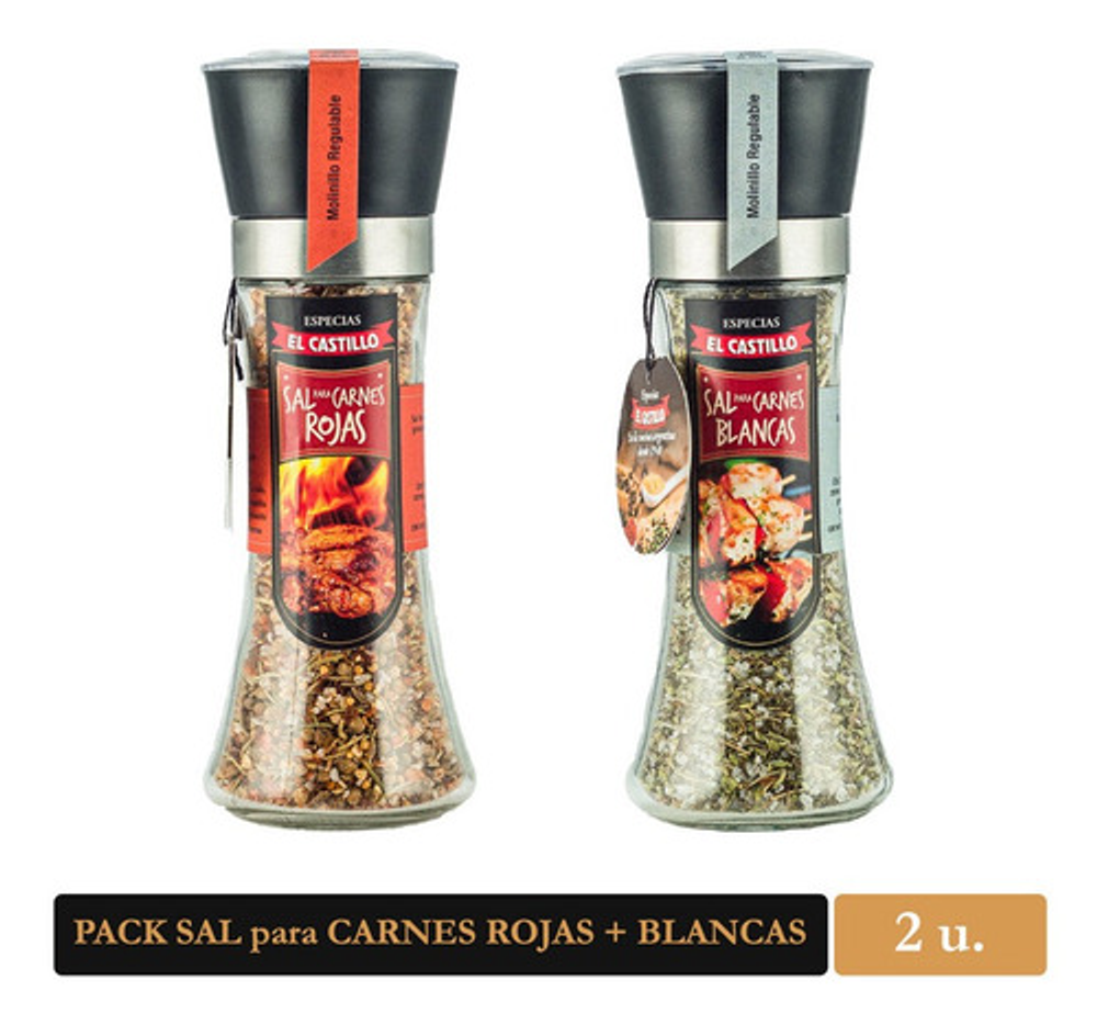 Este Pack contiene nuestras Sales para Carnes: Rojas y Blancas. Presentadas cada una en un molinillo regulable. Son ideales tanto para macerar carnes, previas a su cocción, como para aderezarlas una vez asadas.