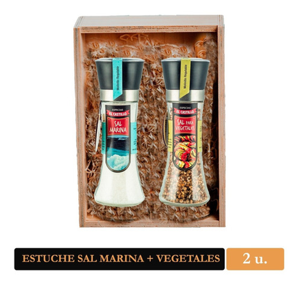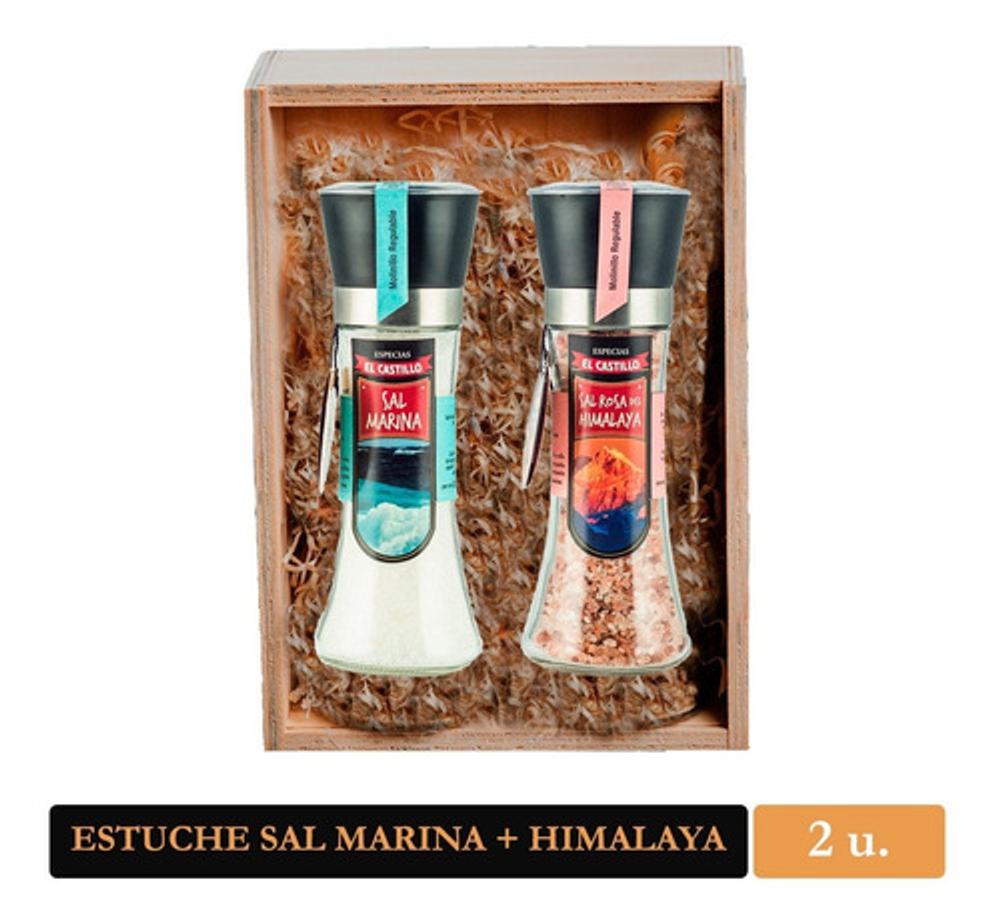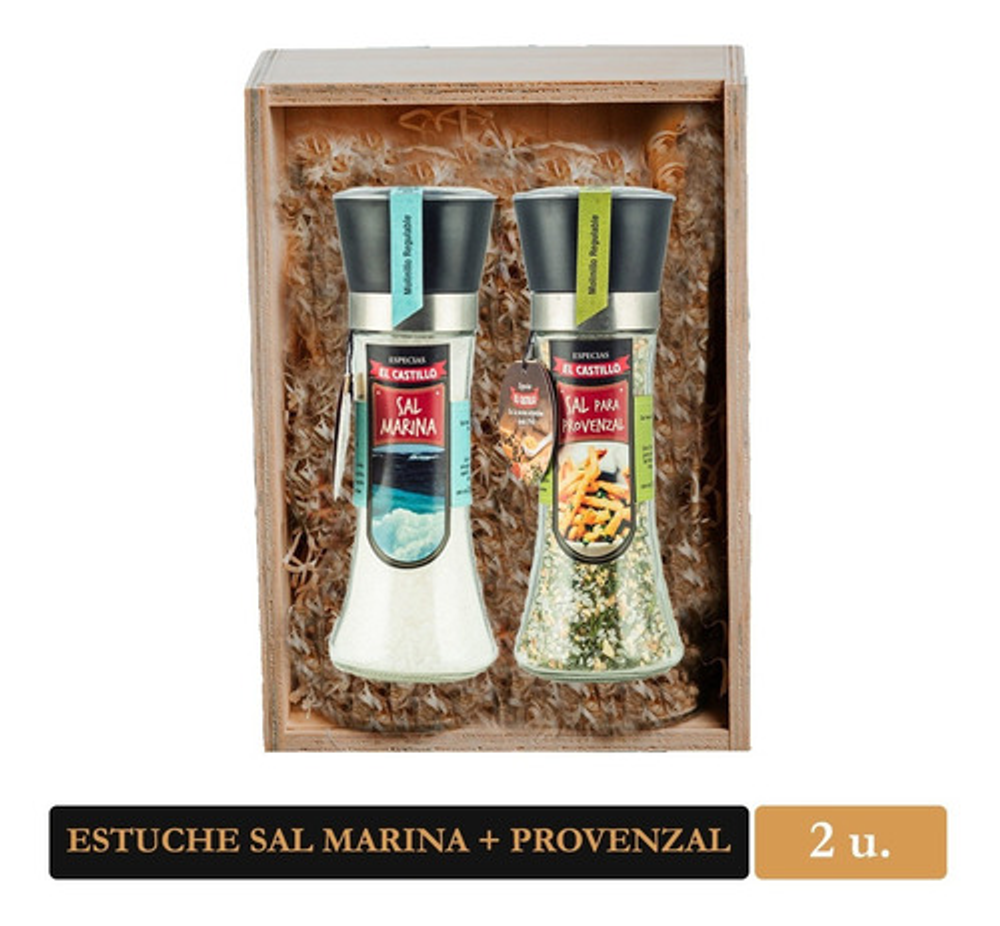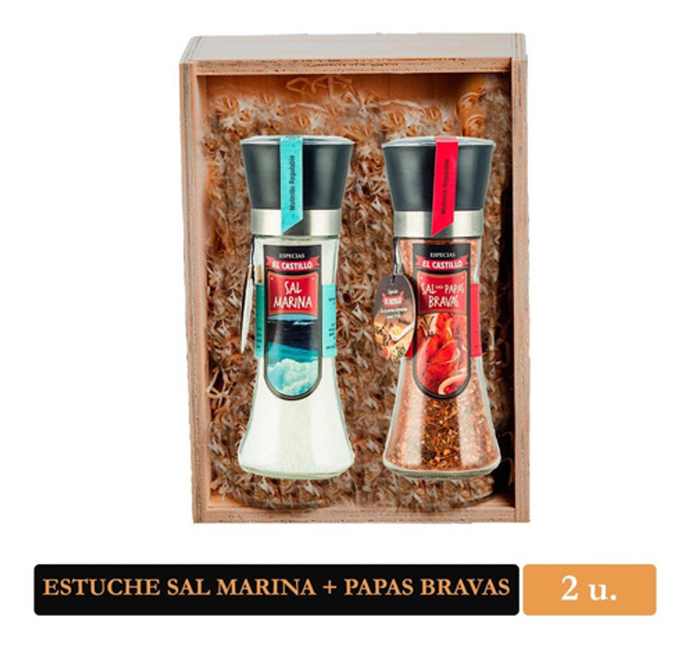 Este Pack contiene un molinillo de Sal Marina de 200 grs, y otro molinillo A ELECCIÓN, presentado en un estuche de madera. Nuestra Sal Marina fue recolectada del delta Ebro, Tarragona, España. Sal secada naturalmente al Sol, sin agregado de productos químicos, ayuda a drenar líquidos del cuerpo y eliminar toxinas de la piel. Puede crear su propio pack con el producto que usted prefiera. Las variedades disponibles son: