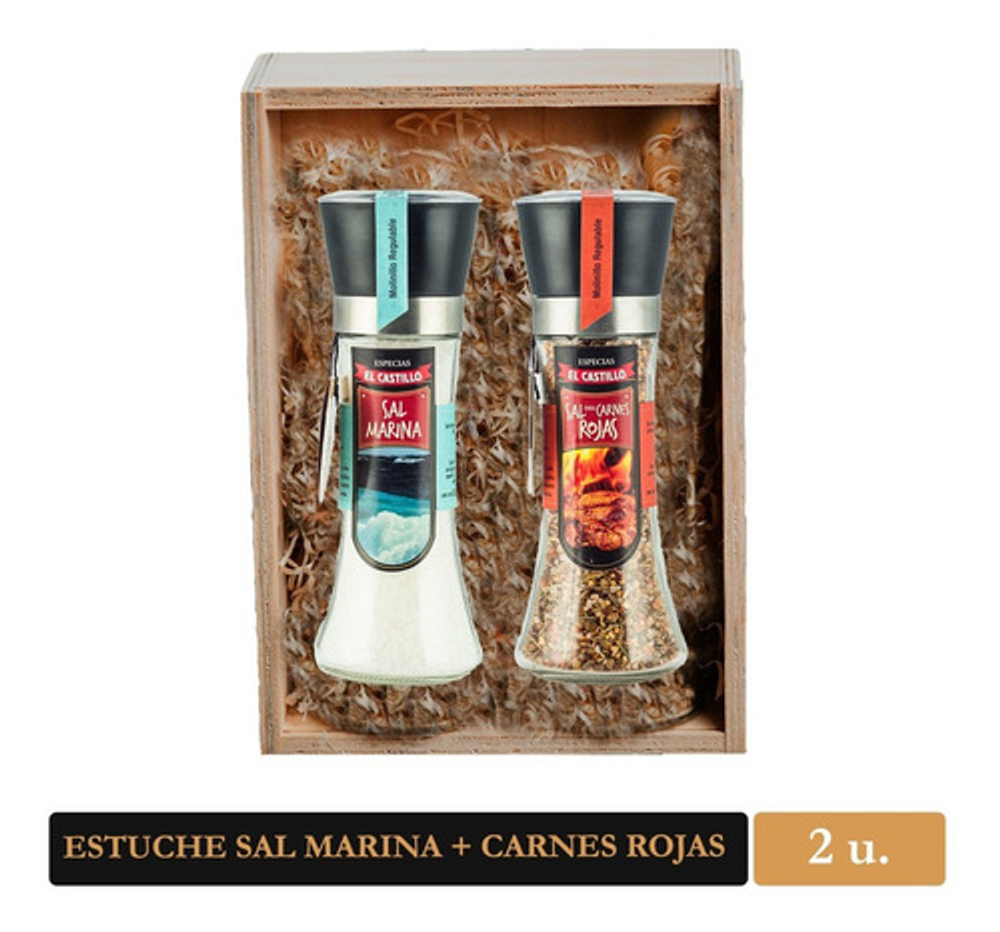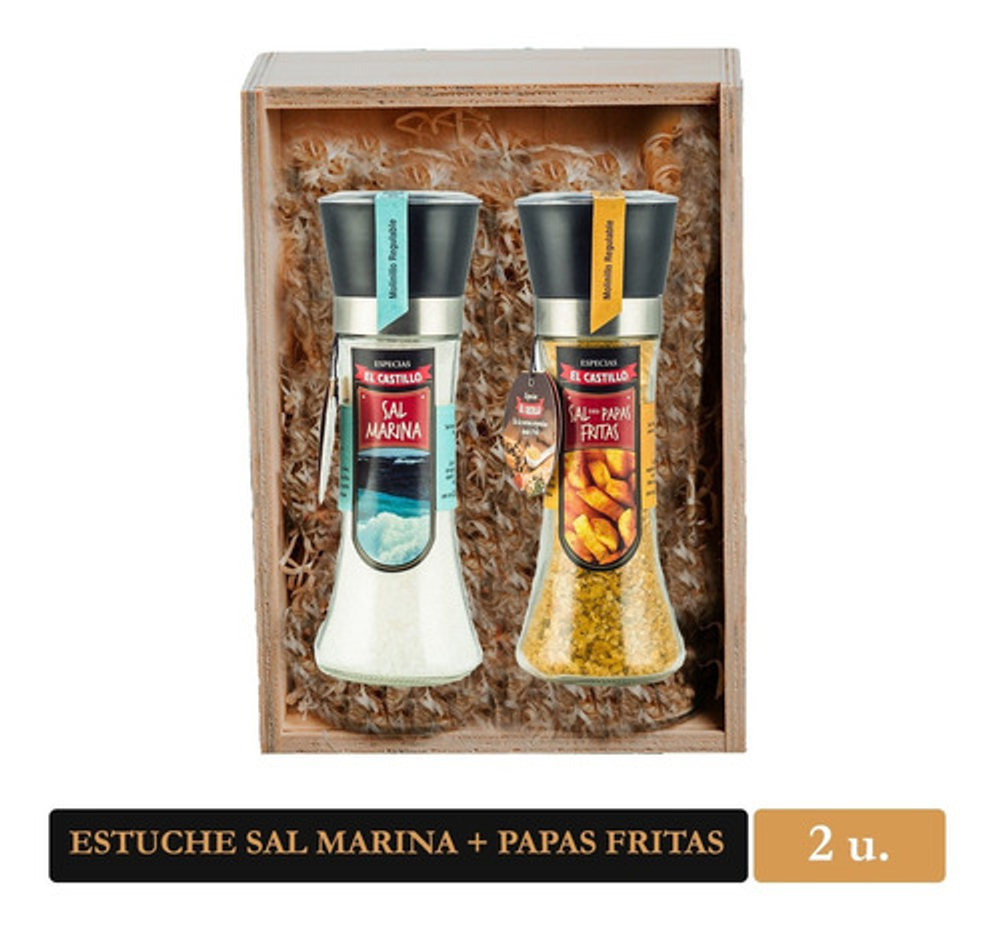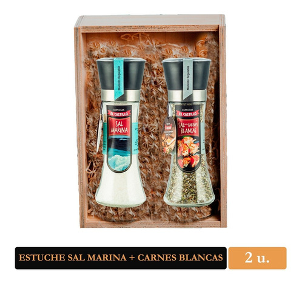 Este Pack contiene un molinillo de Sal Marina de 200 grs, y otro molinillo A ELECCIÓN, presentado en un estuche de madera. Nuestra Sal Marina fue recolectada del delta Ebro, Tarragona, España. Sal secada naturalmente al Sol, sin agregado de productos químicos, ayuda a drenar líquidos del cuerpo y eliminar toxinas de la piel. Puede crear su propio pack con el producto que usted prefiera. Las variedades disponibles son: