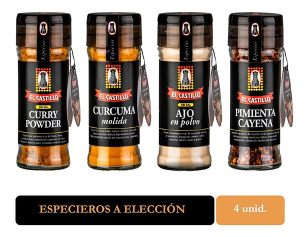 Este Pack contiene 4 Especieros A ELECCIÓN. Nosotros creamos una selección especial de productos, la que se encuentra en la foto portada, pero igualmente puede crear su propio pack con los productos que usted prefiera. Las variedades disponibles son: