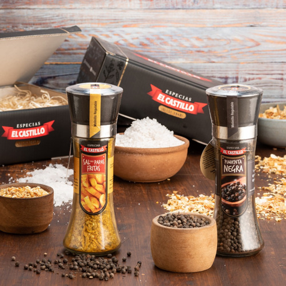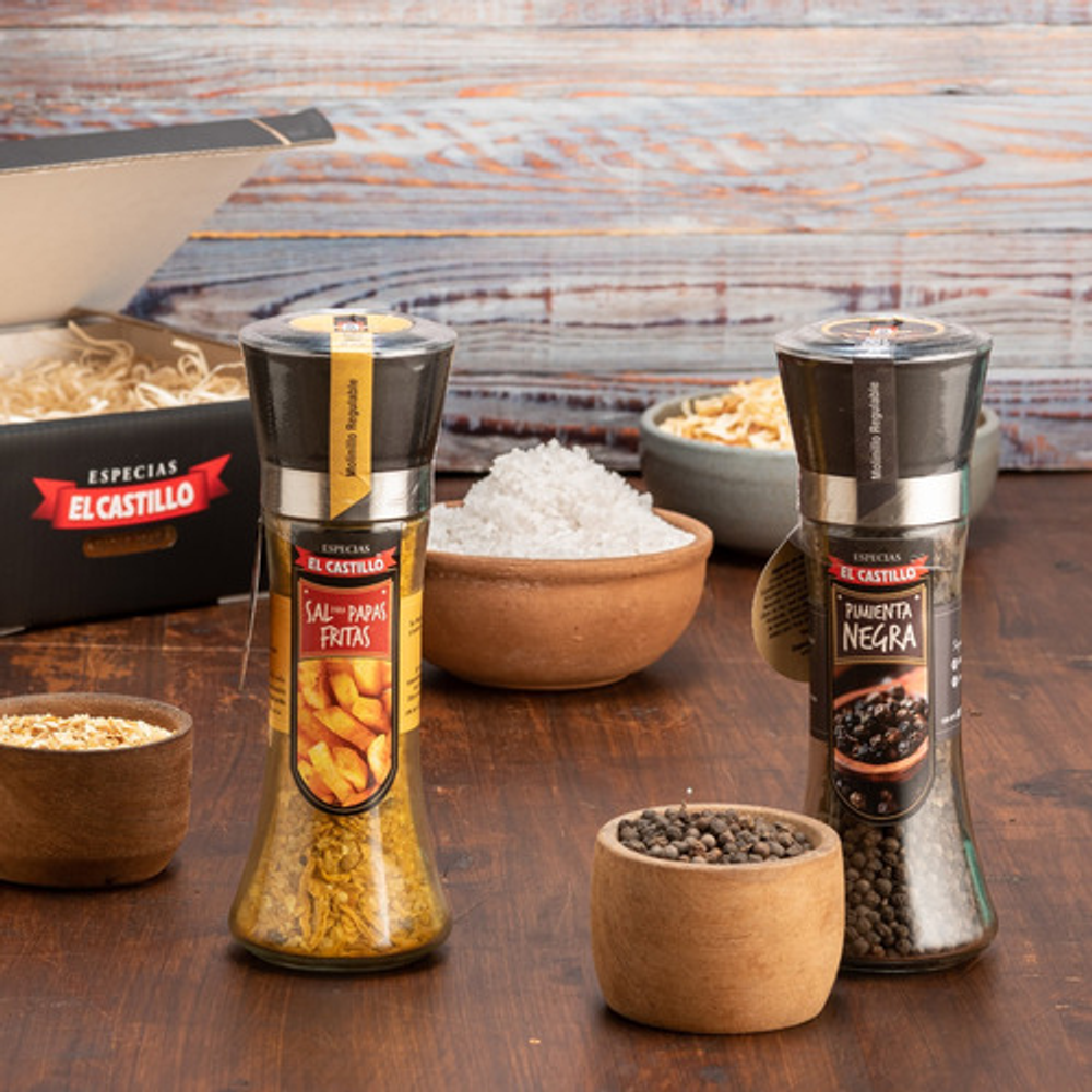 La mejor Selección de nuestros Clásicos Molinillos Profesionales Presentado en un practico BOX GOURMET con finas terminaciones, contiene lo siguiente: • 1 pimienta negra en grano importada • 1 sal para Papas Fritas Nuestros productos son elaborados cumpliendo los más altos estándares de calidad y frescura, importando los clásicos Pimentones y Azafranes desde hace casi 80 años. Este BOX GOURMET esta especialmente diseñado para Regalos, e incluye una Selección de nuestros clásicos Molinillos Profesionales, en un envase de vidrio recargable y reutilizable con cabezal regulable de alto rendimiento SOMOS EL CASTILLO – 80 años llevando el sabor a tus platos Información importante para concretar tu compra. CÓMO COMPRAR