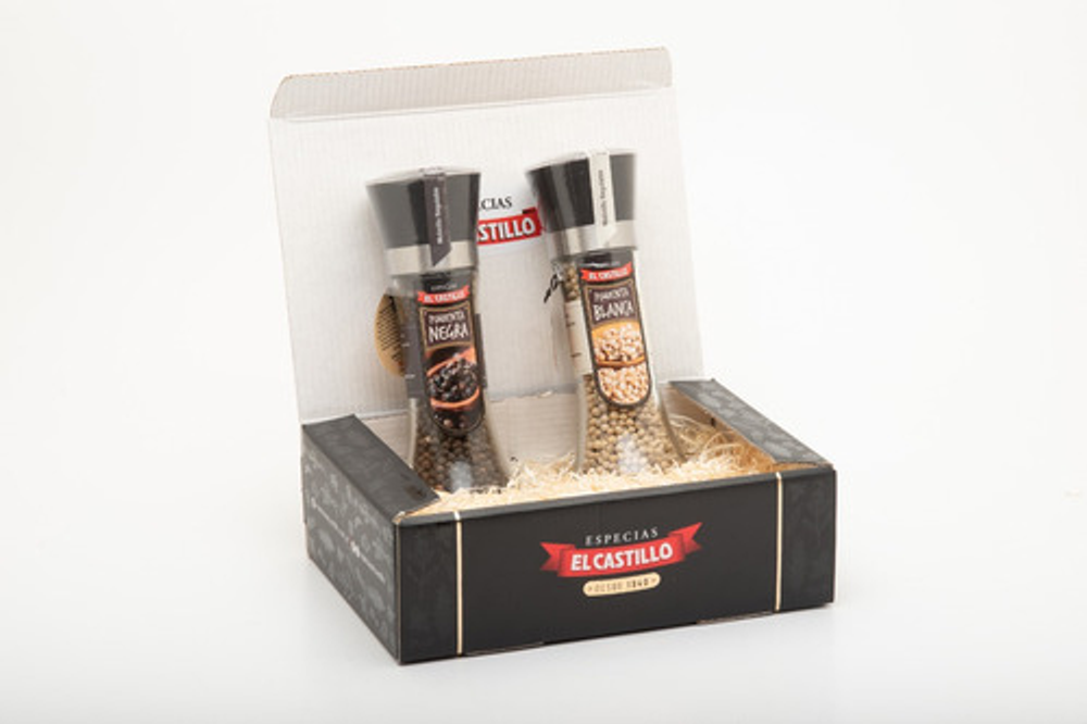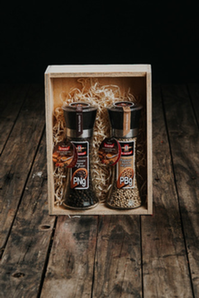 Este estuche de madera con tapa corrediza contiene DOS Molinillos Altos de pimientas (una BLANCA y otra NEGRA) de nuestra Línea Profesional. Es muy útil en todo tipo de recetas como para marinar carnes, arroces, salsas y pastas. Nuestros productos son elaborados cumpliendo los estándares más altos de calidad y frescura.