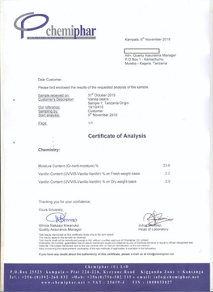 En Tanzania y especialmente en la zona de producción de dicha Vainilla, es en las montañas a Orillas del lago Victoria, y gracias a la fertilidad del suelo + al clima ideal + al proceso artesanal de curado, se obtiene un contenido de Vanillin de 2.2 % e incluso superior. La variedad de vainilla es la del tipo “Planifolia”, y el Curado estilo Bourbon.