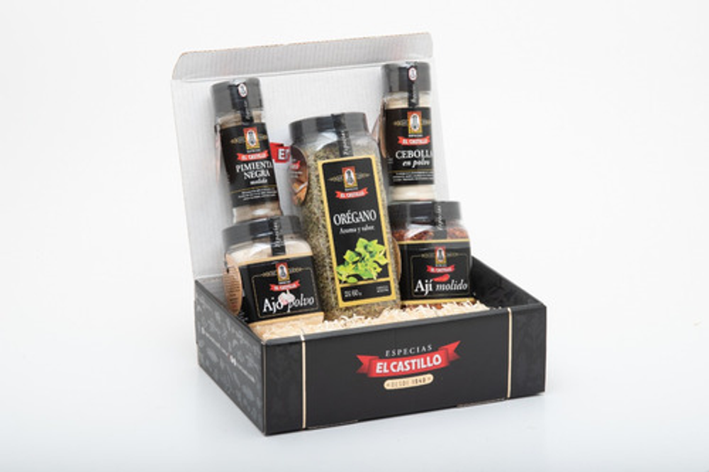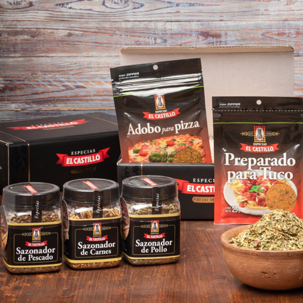 La mejor Selección de nuestros Clásicos para la Cocina Diaria Presentado en un practico BOX GOURMET con finas terminaciones, contiene lo siguiente: • 1 bote de Orégano • 1 bote ají molido • 1 bote ajo en polvo • 1 especiero Pimienta Negra Molida • 1 especiero Cebolla en Polvo Nuestros productos son elaborados cumpliendo los más altos estándares de calidad y frescura, importando los clásicos Pimentones y Azafranes desde hace casi 80 años. Este BOX GOURMET esta especialmente diseñado para Regalos, e incluye una Selección de las mejores especias típicas para la Cocina de todos los días SOMOS EL CASTILLO – 80 años llevando el sabor a tus platos Información importante para concretar tu compra. CÓMO COMPRAR