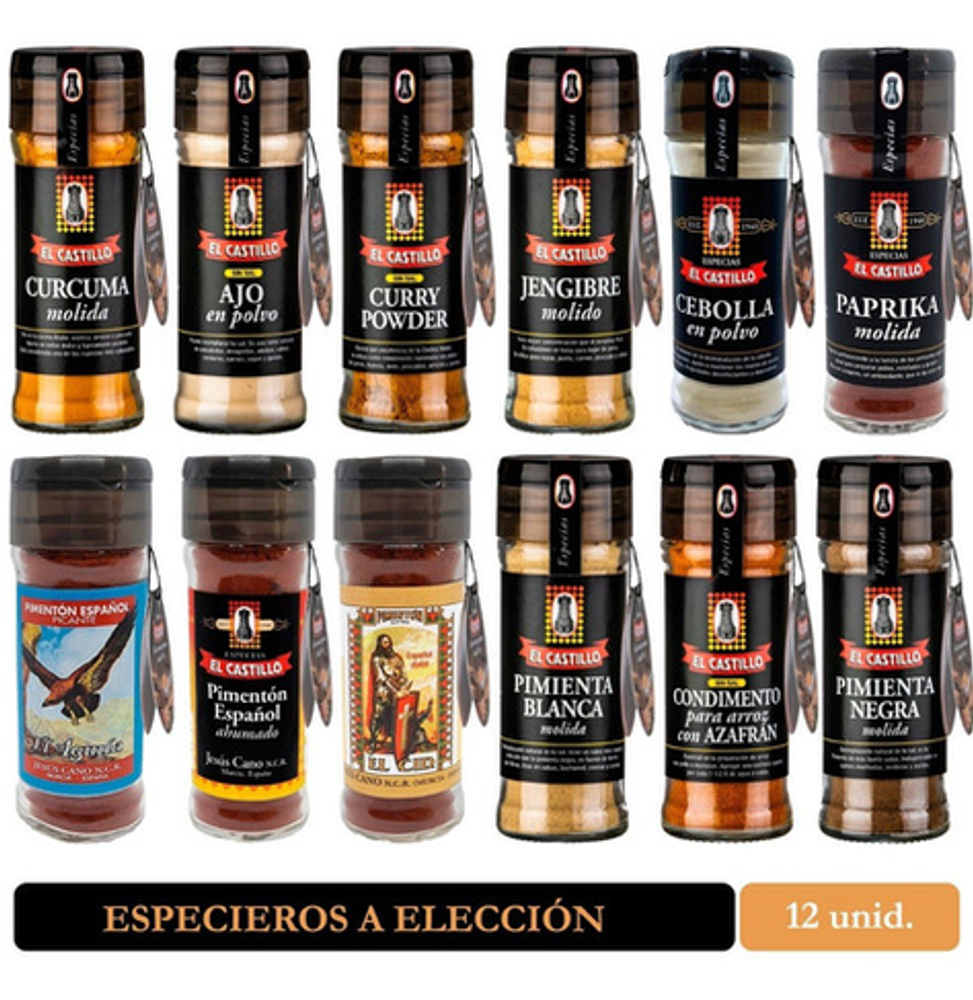 Este Pack contiene 12 Especieros A ELECCIÓN. Nosotros creamos una selección especial de productos, la que se encuentra en la foto portada, pero igualmente puede crear su propio pack con los productos que usted prefiera. Las variedades disponibles son: