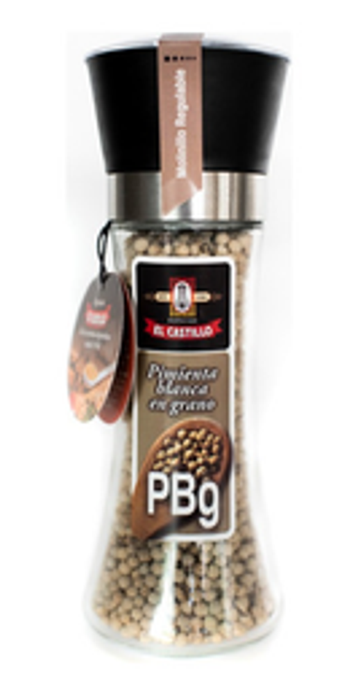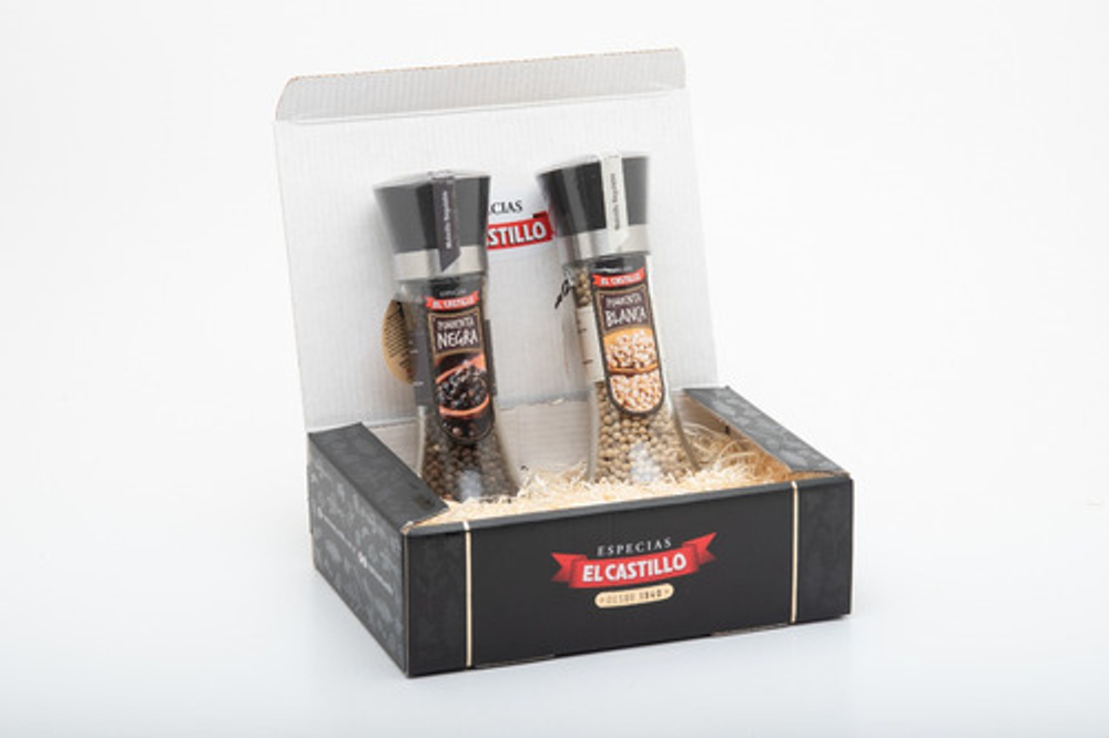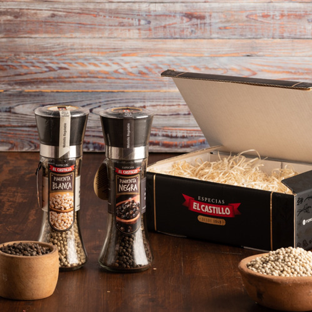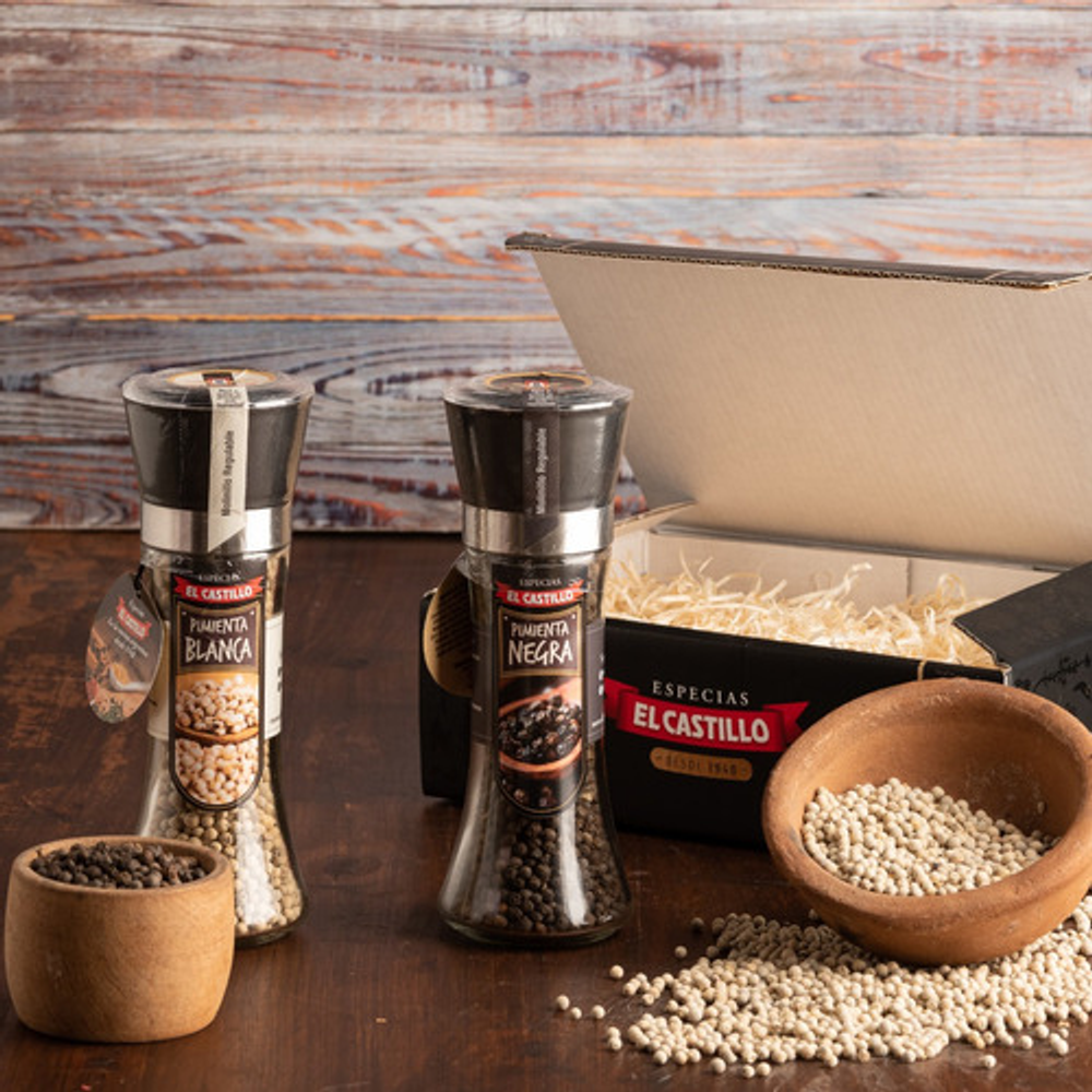 La mejor Selección de nuestros Clásicos Molinillos Profesionales Presentado en un practico BOX GOURMET con finas terminaciones, contiene lo siguiente: • 1 pimienta Blanca en Grano importada • 1 Pimienta Negra en Grano importada Nuestros productos son elaborados cumpliendo los más altos estándares de calidad y frescura, importando los clásicos Pimentones y Azafranes desde hace casi 80 años. Este BOX GOURMET esta especialmente diseñado para Regalos, e incluye una Selección de nuestros clásicos Molinillos Profesionales, en un envase de vidrio recargable y reutilizable con cabezal regulable de alto rendimiento SOMOS EL CASTILLO – 80 años llevando el sabor a tus platos Información importante para concretar tu compra. CÓMO COMPRAR