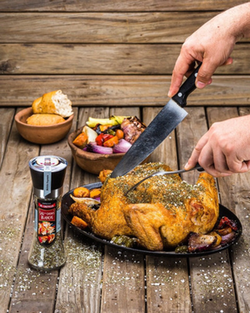 Nuestra nueva Sal para Carnes Blancas es un blend especialmente creado tanto para pescados como para pollos, y otras carnes. Es ideal para macerar carnes previas a su cocción, como para aderezarlas una vez cocidas. Este Blend es presentado en un Molinillo Alto regulable que contiene 120 gramos.
