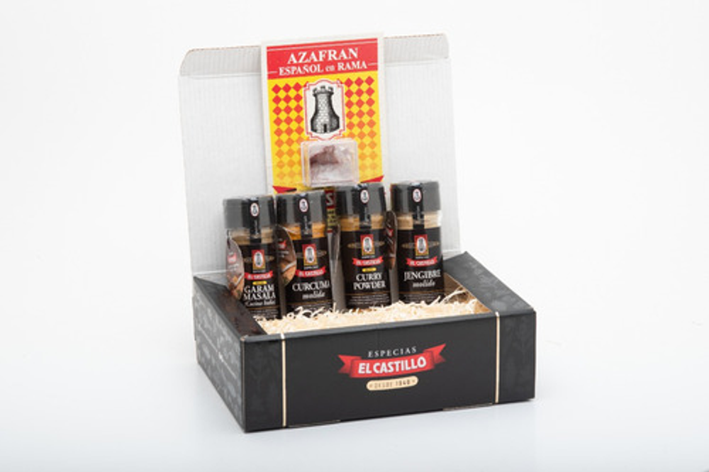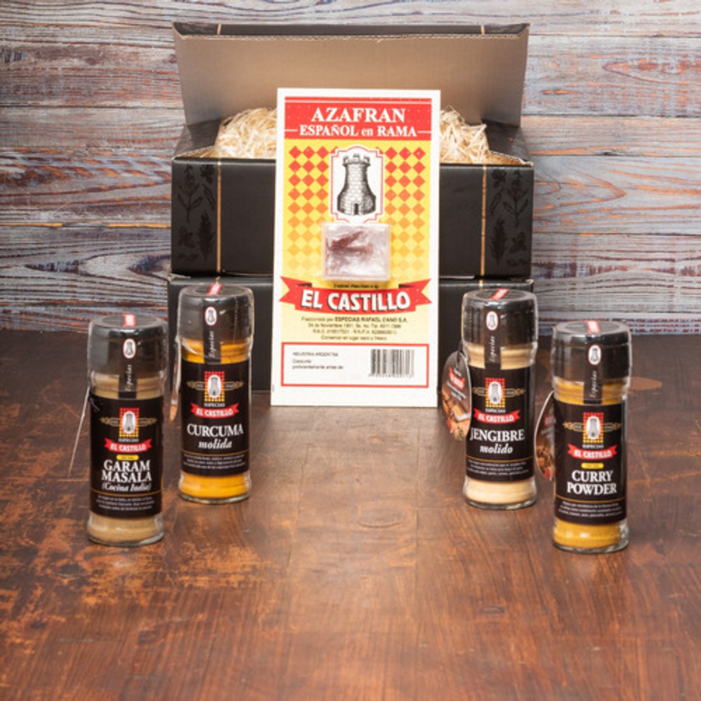 La mejor Selección de nuestros Clásicos de la Cocina Hindú. Presentado en un practico BOX GOURMET con finas terminaciones, contiene lo siguiente: • 1 skin azafrán molido español de 2 unidades • 1 especiero jengibre molido • 1 especiero cúrcuma molida • 1 especiero curry powder • 1 especiero garam masala Nuestros productos son elaborados cumpliendo los más altos estándares de calidad y frescura, importando los clásicos Pimentones y Azafranes desde hace casi 80 años. Este BOX GOURMET esta especialmente diseñado para Regalos, e incluye una Selección de los productos clásicos de la cocina hindú SOMOS EL CASTILLO – 80 años llevando el sabor a tus platos Información importante para concretar tu compra. CÓMO COMPRAR