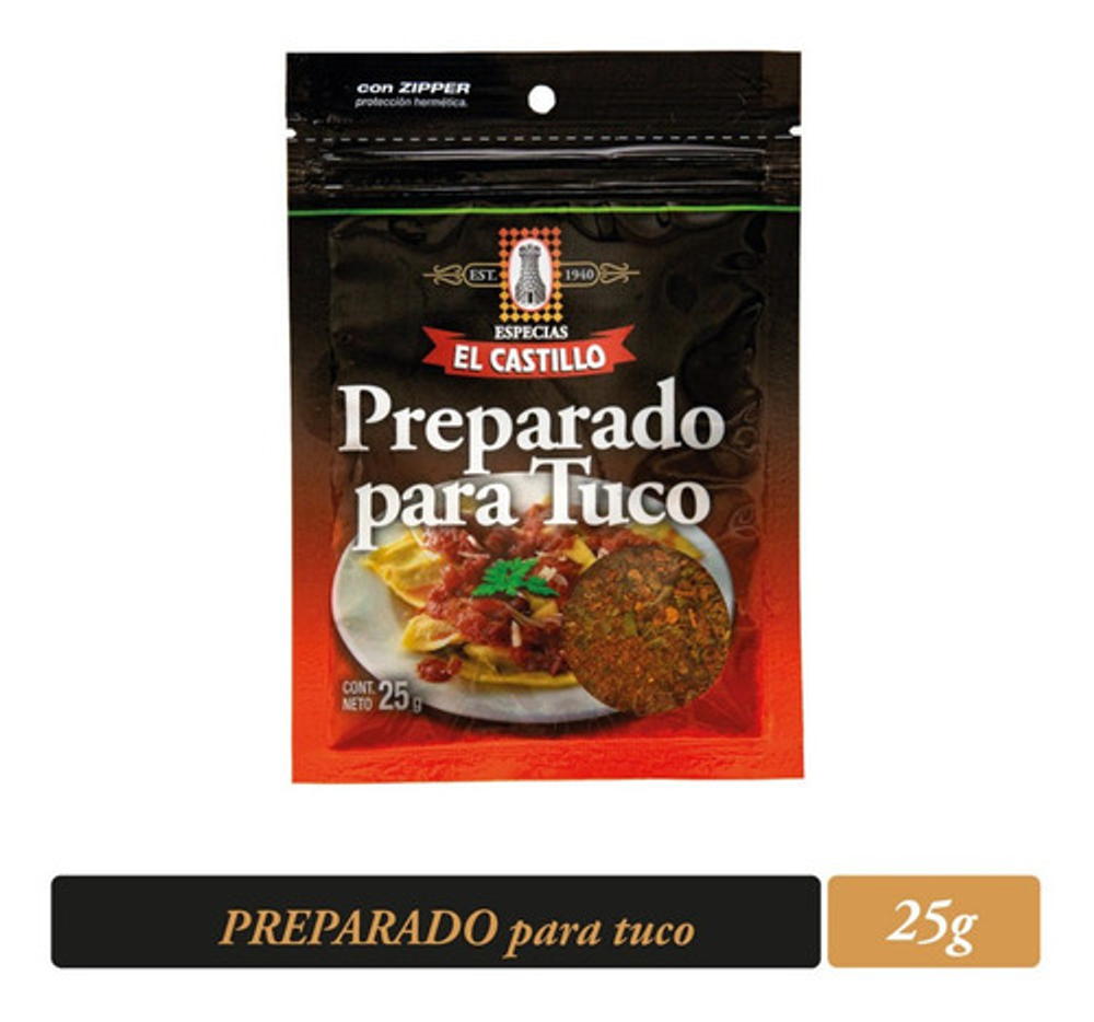 Nuestro Preparado para Tuco simplifica en un único producto todo el sabor requerido para dicha preparacion. Contiene Ají molido, Cebolla en polvo, Ají dulce, Ajo en polvo, Laurel molido, Ajinomoto, Orégano, Perejil, Pimentón y Sal.